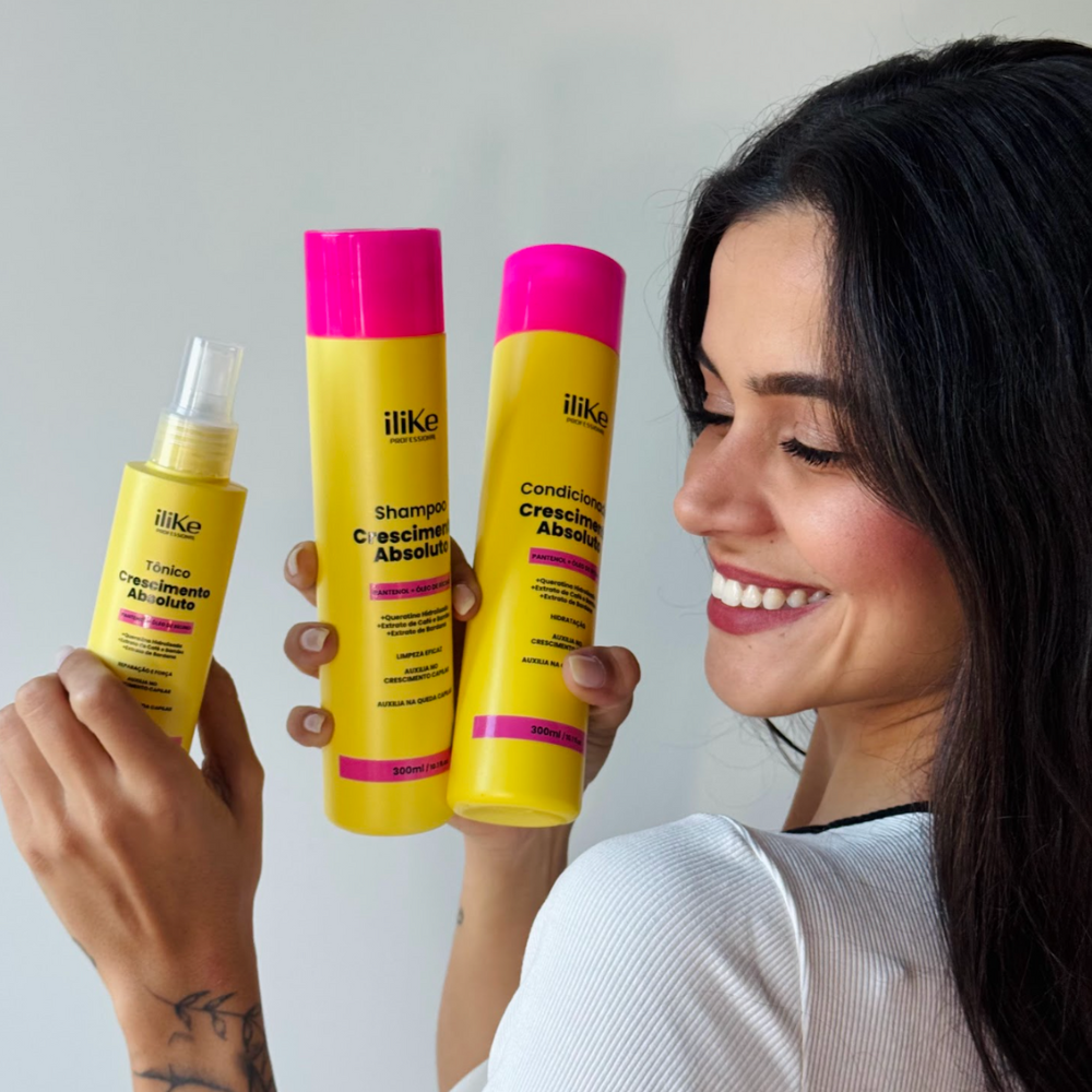 A Linha Crescimento Absoluto é um tratamento completo que combina ativos potentes como Biotina, Queratina Hidrolisada, Pantenol, Óleo de Rícino, Extrato de Café, Bardana e Bambu para agir diretamente na raiz e no comprimento, garantindo: